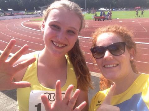 Am Sonntag durfte Melanie Weis (Jg. 1998) dann noch die Spikes für den Dreisprung schnüren! Die noch zur U20 gehörende Athletin hatte sich ein Ziel gesetzt, die 11 Meter Marke überspringen. Trainerin Sinje Kühnert reiste daher mit zum Wettkampf, was sich lohnte. 11,07 Meter im fünften Versuch und Rang 8 bei den Älteren! Die Athletin und die Trainerin strahlten anschließend um die Wette.