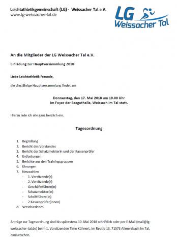 Anträge zur Tagesordnung sind bis spätestens 10. Mai 2018 schriftlich oder per E-Mail (mail@lg-weissacher-tal.de) beim 1. Vorsitzenden Timo Kühnert, Im Reutle 13, 71573 Allmersbach im Tal, einzureichen.