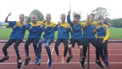 Gestärkt vom Trainingslager starteten Jule Hilkert, Ada Kamprath-Scholtz, Jakob Kienz, Laurin Mennicken, Felix Noll, Pia Wiedenhorn und Ilvie Reutter beim ersten Team Liga Wettkampf am 11. Mai 2019 in Schmiden. Bei durchwachsenem Wetter zeigten sich die Nachwuchsathleten techniksicher beim Stabweitsprung und erreichten Weiten bis zu 2,62m. Mit 144 überlaufenen Hürden und sicheren Wechseln bei der Pendelstaffel setzte sich die Mannschaft an die Spitze des Teilnehmerfeldes. Ganz nach unserem Motto: „Wir sind ein Team – Team LG!“ Beim anschließenden Schlagwurf zeigten Laurin, Felix und Pia ihre Stärken. Neue Bestzeiten über 50 m, trotz Gegenwind, pulverisierten Jule, Pia und Ilvie mit 8,3 sec. Nach einer kurzen Gewitterpause überzeugte das Team mit einem einwandfreien Drehwurf und Weiten über die abgesteckten Zonen hinaus.