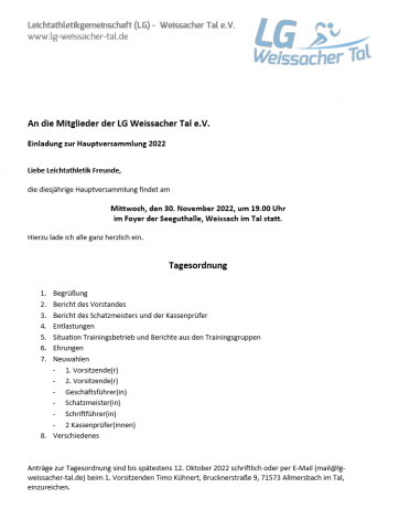 Anträge zur Tagesordnung sind bis spätestens 23. November 2022 schriftlich oder per E-Mail (mail@lg-weissacher-tal.de) beim 1. Vorsitzenden Timo Kühnert, Brucknerstraße 9, 71573 Allmersbach im Tal, einzureichen.