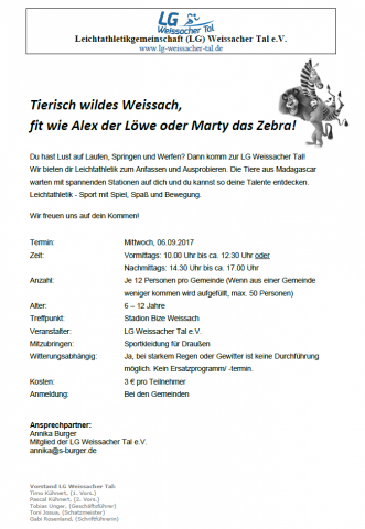 am Mittwoch, den 06.09.2017 findet wieder unser alljährliches Kinderferienprogramm statt. Das Motto in diesem Jahr: "Tierisch wildes Weissach, fit wie Alex der Löwe oder Marty das Zebra!".