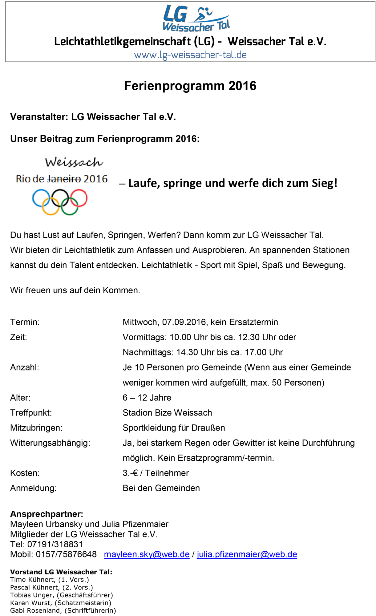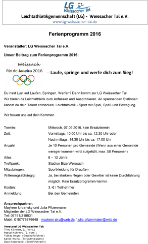 am Mittwoch, den 07.09.2016 findet wieder unser alljährliches Kinderferienprogramm statt. Motto passend zu den Olympischen Spielen: "Rio de Weissach 2016 - Laufe, Springe und Werfe dich zum Sieg!".