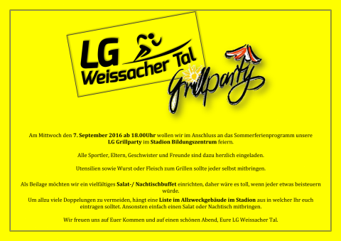 Über Salatspenden oder Nachtisch freuen wir uns! Grillgut ist selbst mitzubringen!