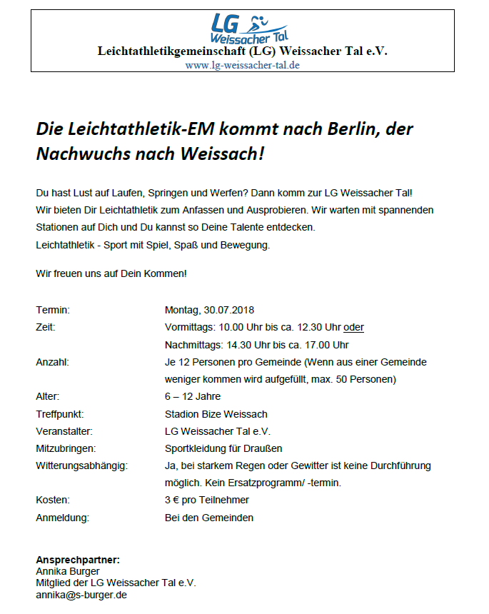 am Montag, den 30.07.2018 findet wieder unser alljährliches Kinderferienprogramm statt. Das Motto in diesem Jahr passend zu den Europameisterschaften in Berlin: "Die Leichtathletik-EM kommt nach Berlin, der Nachwuchs nach Weissach!".