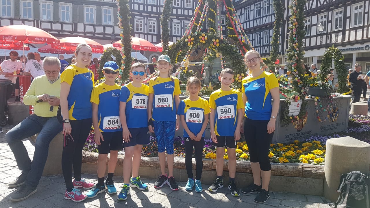 Die U 12 der LG Weissacher Tal absolvierten unter optimalen Bedingungen, fokussiert und mit viel Spaß die 2 km Runde beim Altstadtlauf in Schorndorf am 08.04.2018. Alle Läufer konnten sich im vorderen Drittel des Teilnehmerfeldes behaupten und kamen unter 10 min ins Ziel. Einen bis zur Ziellinie spannenden Wettkampf um die Podestplätze lieferten sich Fabian Huber, Pia Wiedenhorn und Rebecca Friederich. Durch einen phänomenalen Schlusssport sicherte sich Fabian mit 8:20 min den 1. Platz seiner Altersklasse und lief mit Pia ins Ziel. Sie erreichte mit einer Zeit von 8:23 min Platz 2, direkt gefolgt von ihrer Teamkollegin Rebecca, die mit 8:42 min auf dem 3.Platz landete. Top in Form präsentierten sich ebenfalls Max Schützle (9:04 min) und Felix Noll (9:16 min), die sich die Plätze 9 und 10 erliefen. Wir gratulieren den Athleten zu ihren ausgezeichneten Ergebnissen und freuen uns über den sehr gelungen Saisonauftakt.