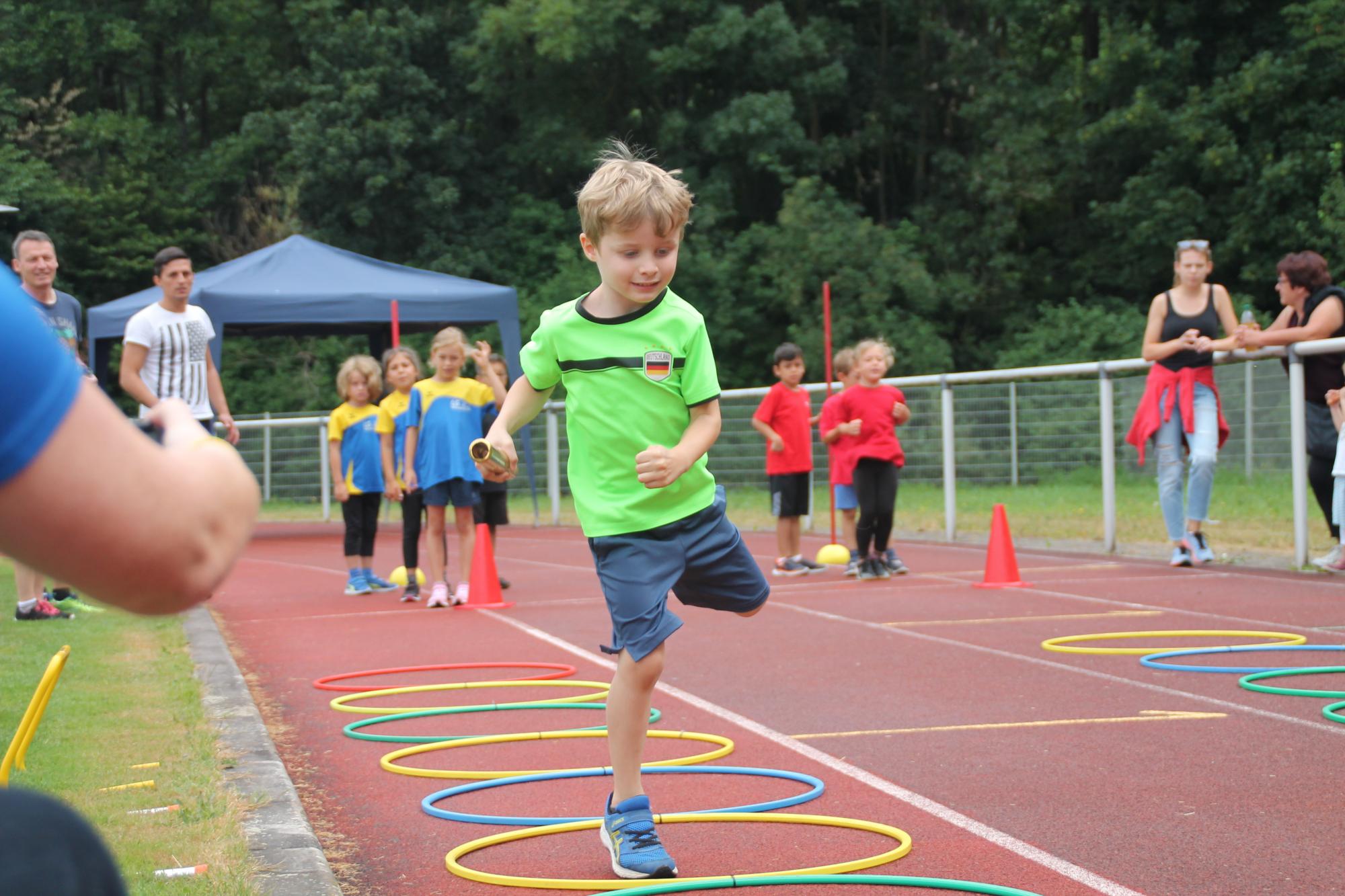 Geschicklichkeit ist in der Pendelstaffel gefragt. Einbeinig über ausgelegte Ringe hüpfend oder bei den Älteren über Mini-Hürden muss der Staffelstab übergeben werden.