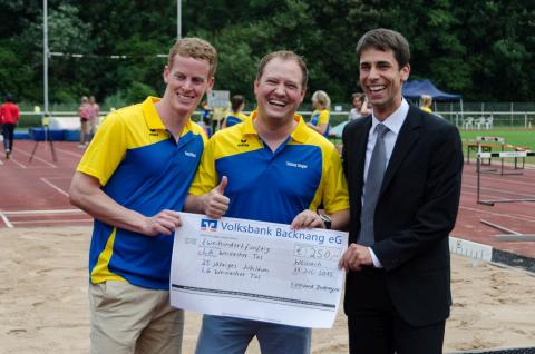 Johannes Weingärtner, Firmenkundenbetreuer der Volksbank und erfolgreicher Läufer, der schon häufig im Trikot der LG Weissacher Tal gestartet ist, hatte zum Jubiläum einen großen Scheck dabei. Timo Kühnert und Tobias Unger duften sich im Namen des Vereins über eine Spende von 250€ freuen.